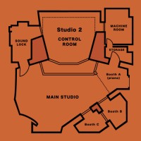 一口坂スタジオはスタジオ2を使用。「SOUND LOCK 」に恵美さん(ボーカル)が、「BOOTH A」にピアノ、「BOOTH B」にギター、「BOOTH C」にベース、そして「MAIN STIDIO」の一角(図むかって右下の角)にバイオリンが位置をとった。