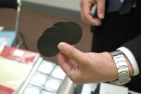 ブースではfo.Qブランドの新製品として参考出品された製品もいくつか見つけることができた。制振スペーサー「G-51」は、好評発売中の「G-53」のスタンダードモデルとしてラインナップされる。スピーカーやアンプ、プレーヤーなど各種AV機器の下に敷いて、強力な制振効果により機器の不要振動を効果的に吸収し、クリアな音質を実現する。直径も50mmφとし、広い用途に使える製品となっている。