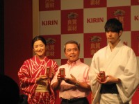 また、この5月には発泡酒「良質素材」も発売された。7月1日の記者会見には、「良質素材」のCFに出演している鈴木京香さんと松山ケンイチさんが浴衣を着て会場に駆けつけた。