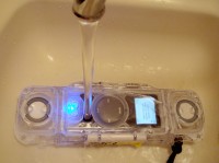 むき出しのスピーカー部など不安はあったが、勢いよく蛇口をひねり水を本体へ直接当てても、問題なく稼動するのを確認。このときは5分くらいだったが、メーカーによると水深1mに30分間耐えられる保護等級を確保しているという。