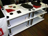 木曽興業のブースでは、制振材「fo.Q」の製品が展示されている。オーディオラックの新製品「WR-312」は有機高分子ハイブリッド型制振シートと、ハイブリッド型ニューセラミックス、木質系材料を使用した積層構造のボードを棚板に使用している。価格は189,000円(税込)。