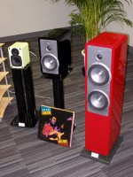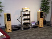 ひときわ目立つスピーカーのひとつとして独・LANSCHE AUDIOの「No.4.1」(ペア¥4,998,000)が上げられる。コロナ放電の原理を応用し、振動板が存在しない構造を持つCORONAプラズマ・イオン・トゥイーターを用いたハイエンド・3ウェイ方式のシステムである。中低域側は20cmミッドレンジユニットと、エンクロージャーの左右下部に搭載された25cmダブルウーファーによって構成される。ちなみに低域側は専用アンプを搭載したセミ・アクティブスタイルとなっており、ストレス感のない澄んだ高域サウンドをしっかり支えるパワー感を持っている。ホーンの奥に紫色の放電発光する光景を確認できるのだが、なかなか不思議な味わいのある風貌を持っている。
