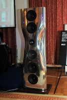 MUONは、4ウェイ7ドライバーの密閉型スピーカー。本体サイズは600W×2,000H×380Dmmで、質量は115kgと、ハイエンドスピーカーならではの偉容を誇る。