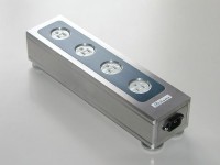 4口出力の電源ボックス。筐体の素材はアルミ合金75材10mmで、高精度加工を行っている。さらにシャーシ組み立て後、特別な磁界処理を行い、シャーシストレスを低減している。