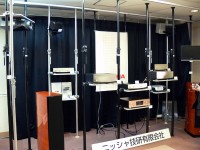 アンプやケーブルプラグ、プロジェクターの設置部材などを取り扱うニッシャ技研は、ポールを使ったユニークな展示を行う。