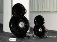 デモの中心はHANIWAブランドのスピーカーシステムと管球アンプ。スピーカーは、同ブランドならではの曲線を主体とした特異なフォルムの「HSP2W10」(420万円/ペア)、「HSPC06」の2台を出展。周波数領域(フリクエンシードメイン)と時間領域(タイムドメイン)の両立を図った独自の「F&T理論」による音質をアピールしていた。