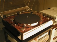トランスローターTourbillon。価格は未定だがアームレスで550万円くらいになるのでは、という話だった。このプレーヤーではマイソニック・ラボの松平社長が自ら「ウルトラエミネント」を装着・調整、「ミスター・スーパーアナログ」の高和元彦氏がご自慢の盤をかけるセミナーを行っていた。その再生音たるや、筆舌に尽くしがたい。