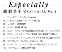 「VIVID productions」から、ピアニスト越野景子の新譜『Especially/越野 景子 ピアノ・アルバム Vol.1』が12月5日に発売される。通常CDのほか、マスターCD-RとデータDVDも同時発売となる。詳細は下記の通り。