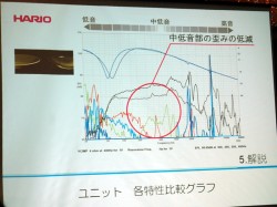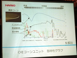 続いて村上氏は「詳しくは明かせないが、専門家によると低音の歪みが非常に少なくなるとの話だ」と、ガラス製コーンの特徴について言及。大きな音を鳴らしたときにコーンが歪まないことが高音質につながっていると説明した。