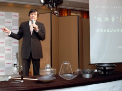 会見には、専務取締役の村上達夫氏が出席。同社の歴史や製品についての説明を行った。村上氏は「今まで楽器をいくつか作ってきたなかで、ガラスはなかなか良い音がするということが分かった」と語り、「ガラスの堅さが新しい音の再生につながるのではないかと考えた」と今回のスピーカー製作に至ったきっかけを説明。楽器素材には堅さが求められる部分があり、そうした点でガラスが有利になるという考えを明らかにした。