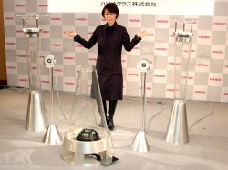 ハリオグラス(株)は、本日都内で記者会見を開催し、コーン部の素材に耐熱ガラスを用いたスピーカーシステム「玻璃音(はりおん)」を発表した。