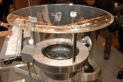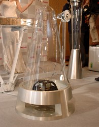 本製品は、ガラス製のサブウーファー1台とミドルレンジ2台、アクリル製のトゥイーター2台という構成のスピーカーシステム。コーン部を薄さ0.5〜0.8mmの薄膜形成による耐熱ガラスで製作しているのが最大の特徴だ。コーンの素材をガラスにすることにより、原音に忠実な音を出せるのではないかというアイデアから製作されたという。なお、本製品は技術研鑽のためのもので、現在のところ市販の予定などは立っていない。