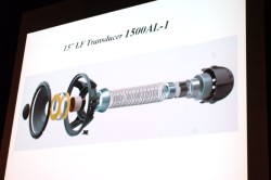ウーファー「1500AL-1」は、S9800に搭載した「1500AL」の改良版。同社マーケティング部次長の藤田氏は、「S9800の後継機には、EVERESTで搭載した1501ALの8Ωバージョンを搭載するのかと考えていたが、JBLは1500ALを改良するという選択をした」と説明。ボイスコイル長を20.3mmから25.4mmに延長し、若干薄くしたことで、コイルの表面積を増やして放熱効果を高めた。また、コイルフォーマーの穿孔を無くしたことも冷却効果の向上に寄与し、これらの対策によって、1500AL-1では1500ALより25%大きなパワーを扱うことが可能になったという。