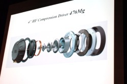 高域ドライバー+ホーン「476Mg」は、新たに開発されたもの。振動板は4インチで、藤田氏は「パラゴンやS9500など、4インチドライバーは特別なモデルのみに搭載されてきた」と説明する。このユニットもハーマン・コンシューマー・グループの主任開発技術者であるJerry Moro氏により設計された。最大の特徴は、振動板にベリリウムと比べてもさらに低い比重のマグネシウムを採用したこと。この軽さを利用し、ダイアフラムはJBLのスタンダードである76ミクロン厚アルミダイアフラムの1.7倍の厚さを持つ127ミクロン厚となっている。ダイアフラムを厚くしたことで強度が上がり、アルミやチタンに比べ、高周波数帯域での正確なピストン運動が可能になると言う。「実は、EVERESTの開発の際にも、振動板にマグネシウムを使うことを検討していたが、その時点ではJBLが求めるマグネシウムの純度やコーティング、厚さなどを満たすことができず、ベリリウムに絞って開発を行った」(藤田氏)という。その後もJerry Moro氏はマグネシウムの研究を続け、最近になって素材のオプションが豊富になってきたことから、今回マグネシウムの採用を決めた。