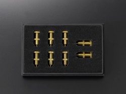 真鍮無垢削り出しの24K金メッキ仕上げを施したショートピンの8個セット。本製品を装着して不安定な入力回路を電気的に短絡させることで、オーディオ回路を安定させクリーンで高品位な信号増幅が可能だという。また入力端子部分の振動により発生する不要な共振も取り除き、機器内部の微細な信号伝送をスムーズに行う効果もある。