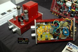さらに、これもハイエンドショウトウキョウ2008で披露されたプリメインアンプキット「TRK-34」も展示。EL34を使用したステレオプリメインアンプで、予定価格は7〜8万円。出力は10W+10W程度となる見込み。「小型の筐体なので回路設計がかなり難しかった。電源部がかなり大きいのも特徴」(山崎氏)という。発売は7月頃を予定する。