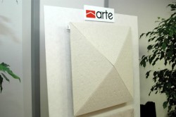 さらに同社は、日本製のオーディオパネル「arte」の発売を7月中旬に開始することも明らかにした。ピラミッド型のデザインを採用したことでインテリア性を高め、付属のピンで簡単に取り付けられるのも特徴とのこと。サイズは600W×600Hmmで、質量は1kg。価格は38,000円〜39,000円程度になる見込みという。