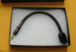 同じくMicroshar社のiPhone/iPodケーブルも、片側がステレオミニ端子の「MSPHONELIN-B5-6IN」(予価1万円程度/20cm)と、ステレオRCA端子の「MSPHONELIN-RCAS1-35IN」(予価2万円程度/87.5cm)の2モデルを用意する。ステレオミニ端子モデルはiPodからヘッドホンアンプにつなぐ用途を、RCA端子モデルはiPodから据え置き型オーディオシステムに接続する用途をそれぞれ想定している。どちらも純度99.99%の無酸素銅線を採用し、特注クロスリンクポリエチレン絶縁材を使用している。プラグ部には24K金メッキが施されている。