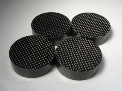 ドライカーボンで銅をサンドした本インシュレーターは、ひとつひとつ手作りで製作されている。カーボンと銅の接合面はドライカーボン内の樹脂のみで接着している。本製品を使用することにより、カーボン無垢の良さを残しつつ音像がはっきりとしステージングも拡がるという。