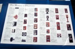 三菱電機エンジニアリングは、スピーカーユニットなどDIATONEに搭載されているパーツやピュアボロン振動板とその素材などの展示を通じてDIATONEブランドの製品とテクノロジーを紹介している。ブースにはDIATONEの歴史がわかる一覧表も展示されている。