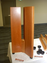 また同社からは参考出展として、木製スピーカースタンドとインシュレーターも展示されていた。