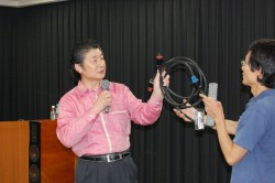 午後から実施された『季刊・オーディオアクセサリー』誌の好評連載、「旬の音本舗*福田屋」でお馴染みのオーディオ評論家、福田雅光氏を講師に招いての試聴会では、プラグ/コネクターのP/Cシリーズの音質の違いと、電源の重要性、ケーブルの選択と配線方法のコツなどを、実際に組み立てた電源ケーブルで確認。会場を訪れた人たちからは、全てのオヤイデのプラグ/コネクターシリーズの音を聴き比べるという貴重な体験ができ、喜びの声が上がっていた。また、未発売の新製品もお披露目され、時間一杯まで盛りだくさんで楽しい試聴会となった。