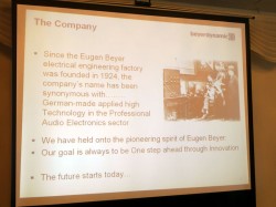 beyerdynamic社は1924年、Eugen Beyer氏によってドイツに設立された老舗メーカー。本社はHeilbronnにあり、従業員数は約300名。このうち約200名は開発や製造に従事しているという。同社が主力としている業務は、カンファレンスソリューション、ステージパフォーマンス、スタジオアプリケーションなどの業務用機器と、一般向けのヘッドホンの4つ。1937年に世界初のダイナミックヘッドホン「DT 48」を発売し、このモデルは現在も販売を継続するなど、数々の名機をこれまで市場に投入してきた。また業務用機器はビートルズが初めて行ったツアーで同社の機器が使用されたほか、2002年、2006年のワールドカップ、2008年の北京オリンピックでも同社製品が採用されたのだという。