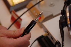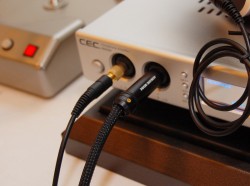 ケーブルは左右両側着脱式を採用。端子設計はミニXLRを採用し、高音質化を図っている。ケーブル本体は高い伝送特性を持つPCOCC-A単線2芯銅箔シールドケーブルを専用設計し、用いている。ジャック形状は標準6.3mmプラグ仕様となり、音質に影響を及ぼす鉄芯を取り払うことで、メッキも含めた完全非磁性体構造とした。また導通部には銀+ロジウムメッキを施している。プラグキャップは航空レベルのジュラルミン素材を採用し、高い制振効果を持たせている。オプションとして、自社製無ハンダ・ネジ留め式XLRプラグを用いたバランス接続ケーブルも準備が進められているという。
