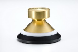 同社では今回新たに新製品のアナログスタビライザー「C-35」を発売した。基本部はプラスチックで成型され、銅との間にテフロンが嵌めこまれている。底面は周縁部だけが接触するように内側が窪んでおり、シリコン製のダンピング素材でチューニングが施されている。センタースピンドルはクランパー式で、頂部のつまみを回すと締まる仕組みになっている。これによりプレーヤーの各種でサイズが異なる軸部の、いずれのタイプもしっかりと固定することができる。質量は480g。適度な重量と合計4種類に及ぶ素材のブレンドが絶妙な音質を引き出す。