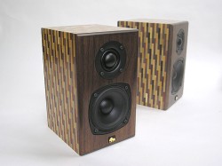 シンプルな形状に華やかな寄木細工を4面使用し、バッフル板と背面板にはブラックウォールナット無垢材を採用した2ウェイバスレフ型スピーカー。