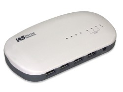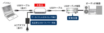 USBオーディオのUSBデータパケットのタイミング補正と、USBバスパワーの品位向上を図った、セルフパワータイプのUSBハブ。PCとUSBオーディオ機器の間に接続する。