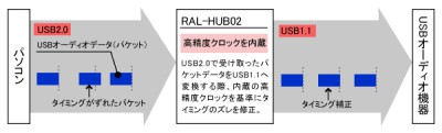 本機は内部に±5ppmという高精度なクロックを内蔵。PCのUSBポートから出力されるオーディオデータは、パケットのタイミングにズレが発生しがちだが、本機では、USB2.0のオーディオデータパケットからUSB1.1パケットに、内蔵クロックをもとに高精度な変換を行う。これによりジッターを抑えられるという。
