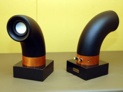 DTルームに入るとまず来場者を出迎えるのがブランコオーディオのブース。こちらでは特徴的な形状をしたスピーカー「R-1」が展示されている。