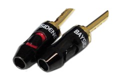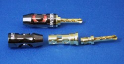 本体、カバー部ともに真鍮製で、プラグ部分にはOFCカッパーを採用。振動面および音質面から優れたプラグを追求したバナナプラグ。接触面や接触力の弱さが指摘されることの多いバナナプラグだが、プラグ形状をクレープタイプにすることによって、それらの弱点をカバーするよう設計されている。ケーブルの接続は、2本のネジ留め式で簡単かつ強力に接続することが可能。高級感のあるチタンコーティングの鏡面仕上げの採用で、より上品でスマートな外観を追求している。RCAケーブルなどと共通のデザインで統一感がとれる点も特徴。