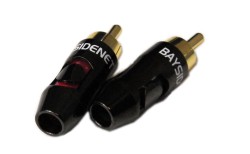Baysidenet オリジナル バナナプラグ(クレープタイプ)と同デザインのRCAプラグ。材質はもちろん、本体、カバー部ともに真鍮製で、プラグ部分にはOFCカッパーを採用。ゴールドメッキ仕上げの内部スリーブや、絶縁材にはテフロンを使用しており、振動面からも音質面からも優れたプラグを追求している。内部は二重構造で、ケーブルを締めつけながら強固に固定でき、シールド線の処理も挟み込むだけで簡単に接続できる(プラス側はハンダづけ)。高級感のあるチタンコーティングの鏡面仕上げ採用によって、より上品でスマートなRCAケーブルの自作ができる。