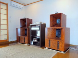 今回の試聴会は、クリズラボの栗原信義氏を軽井沢から迎えて、村内ファニチャーアクセス八王子本店西側ログハウスにある、“より専門的に”“より音にこだわった”オーディオショップ「SAND GLASS(サンドグラス)」にて、励磁型スピーカーユニットを使用した大型3Wayシステムとの組み合わせで、その効果がデモンストレーションされる。