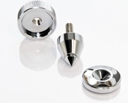 本製品は240LINE用に、さらなる高音質タイプの交換スパイクを求めるユーザーの声を受けて開発されたものであるという。同社の600LINEのために開発された重量級のスパイクを、高品位さをそのままにダウンサイジングした、スパイクとインシュレーターがセットになっている。サイズは 40W×45H×40Dmm。