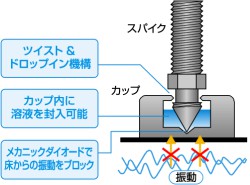「T-PROP」は、スパイクとカップ(受け皿)の2ピースに分かれたツイスト&ドロップ機構式インシュレーターで、上からの振動を逃がしながら床下からの振動をブロックするという、メカニックダイオード方式を採用。スパイクをカップにねじ込んで一体構造にすることが可能となっている。