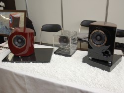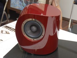 プラス産業は、年末に向けて発売を予定しているスピーカーシステム「sui」を出展した。振動板メーカーである同社が、使用する素材や形状にこだわって開発しているモデルで、静岡の家具デザイナーと共同で手がけている。本朱塗りモデルとマホガニーの玉杢仕上げのモデルを1機種ずつ用意し、価格帯はそれぞれペア60〜80万円を想定している。