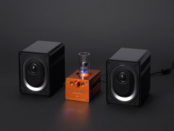 電源はアダプターからプリ/パワー部それぞれに別々のソケットに供給する、音質にこだわった設計を採用した。音声信号はプリ/パワー部を3.5mmステレオラインケーブルで接続。電源を投入すると、真空管部にブルーのイルミネーションが点灯する。