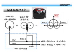 本機の特徴は、MSステレオ方式と90度XYステレオ方式の両マイクを内蔵する点。MSマイクは、プロフェッショナルな現場で重宝されているノイマンのMSマイク「SM69」をリファレンスにして開発されたという。MSマイクは、単一指向性の「Midマイク」と双指向性の「Sideマイク」をトランス回路内でマトリックス接続する構造の、エレクトレットコンデンサー型のマイク。Midマイクに繋がるSideマイクのミックスバランスを広めたり狭めたりすることで、ステレオ幅を自由にコントロールすることができる。本機では、録音音源のSideマイクレベルを調整してステレオ幅をコントロールし、RAWデータで保存することが可能となっている。