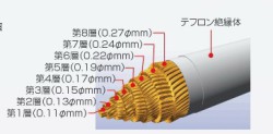 NVSサウンドケーブル製品の特徴は、6N高純度OCCリッツ線を組み上げた特殊な導体構造にある。径の違う導体を合計150本以上も使用し、特殊な手法で8層に撚りあげている。さらにこの導体の隙間には特殊な金属パウダー充填させており、これによって類のないほど強力な制振効果と併せて電磁シールド効果を引き出すことができるという。