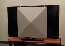 80%の拡散と20%の吸音を実現するルームチューニングアイテムは壁掛け用の「ピラミッドウォール」と天井用の「ピラミッドシーリング」、コーナー用の「テトラ&テトラフロア」のほか、新たにテレビカバー専用の「ピラミッドTVカバー」も初登場している。