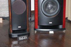 「TAD-E1」は独自の蒸着法で加工したベリリウム振動板使用のCSTドライバーを搭載するなど、「TAD-R1」「TAD-CR1」で培った技術を投入しているのが特徴。14cmコーン型/3.5cmドーム型ユニットを合わせた同軸ドライバーと、18cmコーン型ウーファー2基を搭載した3ウェイフロア型スピーカーで、「TAD-R1やCR-1と比べ、一般のマンションでも置ける現実的な大きさ、そして頑張れば手の届く価格を目指した」(TADラボ社長 平野氏)という。再生周波数帯域は28Hz〜100kHz。最大入力は250W、出力音圧レベルは88dBで、定格インピーダンスは4Ω。