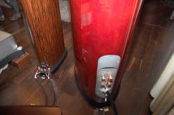 スピーカー端子はバイワイヤリング対応。R1、CR-1と全く同じ真鍮削り出し端子を、10mm厚のアルミプレートにマウントしている。太いケーブルを使用した際や、Yラグ端子を使う場合も、ケーブルに負担をかけない結線が可能だという。