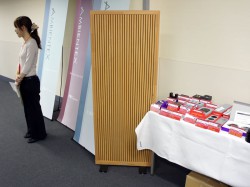 また、関口機械販売のアコースティックリバイブ製品の紹介スペースも展開。ノートPC内の音源を使い、ヘッドホンのリケーブルによる効果を体験できるようにもなっている。また、本日発表された北陽木工のルームチューニング材“AMBIENTEX”(関連ニュース)もブースの一角に設置されていた。
