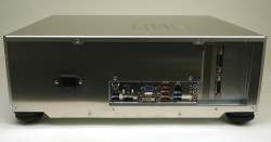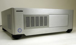本体寸法は435W×115H×390Dmm(突起部含まず)。リアパネルは完全オリジナルファンレス仕様のパネルを採用し、天板は完全ファンレス化に伴ってエア抜き用スリットを追加したパネルを搭載。フロントVFDパネルも、新規にスリット入りのアルミパネルを取り付けた。HDDベイをスチール製の完全オリジナルのものとしたほか、光学ドライブベイは省略。