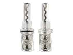 Yラグ仕様の「KS-103Y」は端子部を2枚刃とすることで、確実な圧着を実現。一方のバナナプラグ「BFA-103B」は、フルサーフェスコンタクト仕様で接触面積を大幅にアップさせている。
