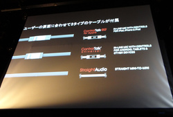 本体パッケージには3種類のケーブルが付属しており、iOSデバイス対応の3ボタン・マイク付コントローラー搭載「ControlTalk for Apple」、Androidデバイスにも対応するシングルボタン・マイク付コントローラー搭載「ControlTalk Universal」、通常のストレートケーブルの3本。