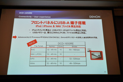 USB端子はフロントパネルにType Aの端子を搭載。iPod/iPhoneの音声ファイルや、USBメモリーに保存したWMA/MP3/AACファイルや、本機から新たに非圧縮音源のWAVファイルの再生に対応している。接続時にはiPodの充電も可能だ。